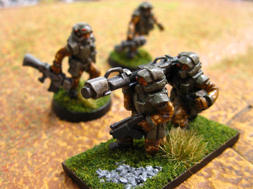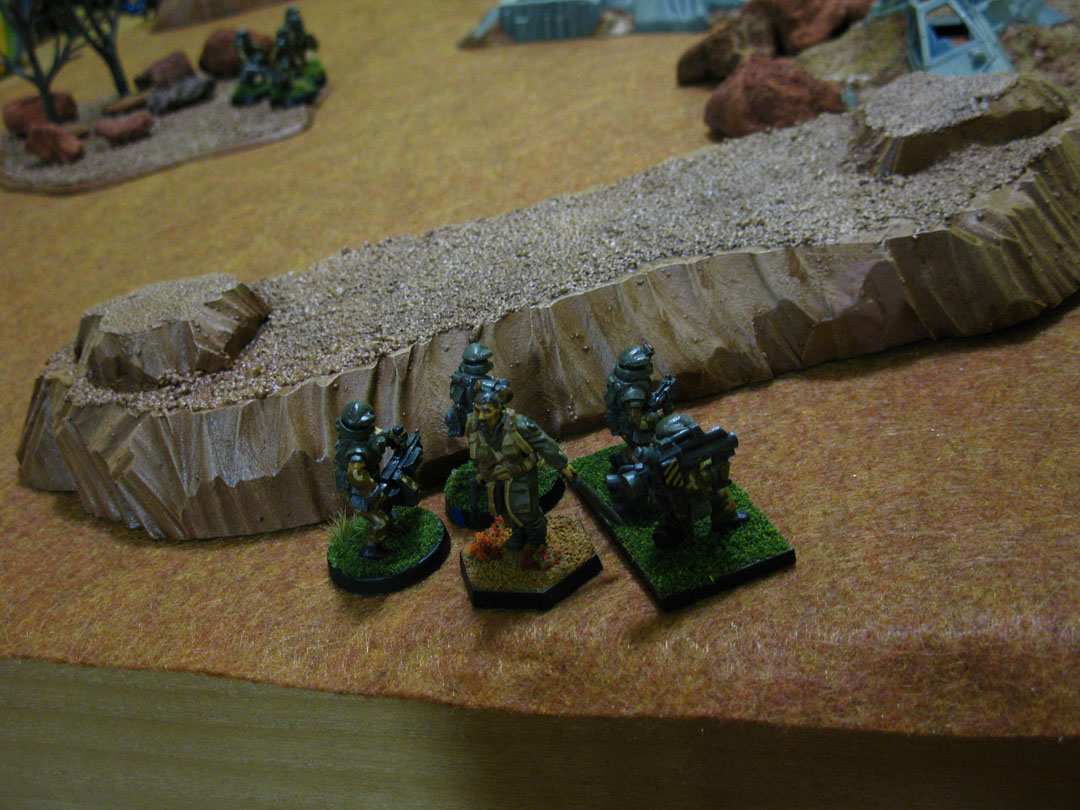 The Skybolt squad in the lower right corner has been 'wiped out' in game terms. The soldiers aren't dead, but there isn't a healthy trooper available to make a first aid check, so the unit stays tipped over until its casualties are assessed. As it happened, this squad wasn't reached by a healthy trooper before the end of the game, so the tipped-over models counted as captured soldiers for the scenario. This particular victory condition put the Neo-Soviet players over the top when we tallied up points at the end.Anyway, the Skybolts slogged through a fearsome hail of gunfire as the Neo-Soviets enveloped them with superior numbers. Luckily Skybolt one squad that had spent pretty much the entire game on overwatch proved very useful at disrupting the Neo-Soviets advance. With just 3 combat effective soldiers, this little fireteam held up at least twice their number of lower quality Neo-Soviet troopers. This sacrifice allowed the main squad to escape with the pilot at the end of Turn 8. Here's the squad (with pilot) as they make their exit off the battlefield. The rearguard fireteam is just visible in the distance; those soldiers were honored posthumously for their dedication to the mission.